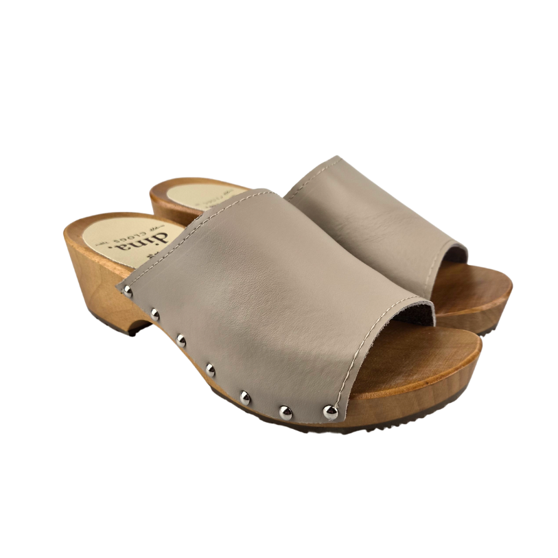 These classic Dina wooden sandals in beige are stylish and durable, featuring elegant studs. Made of high-quality wood and sturdy leather, they offer a natural look combined with optimal comfort. Ideal for warm days when you want to wear a timeless and reliable sandal.